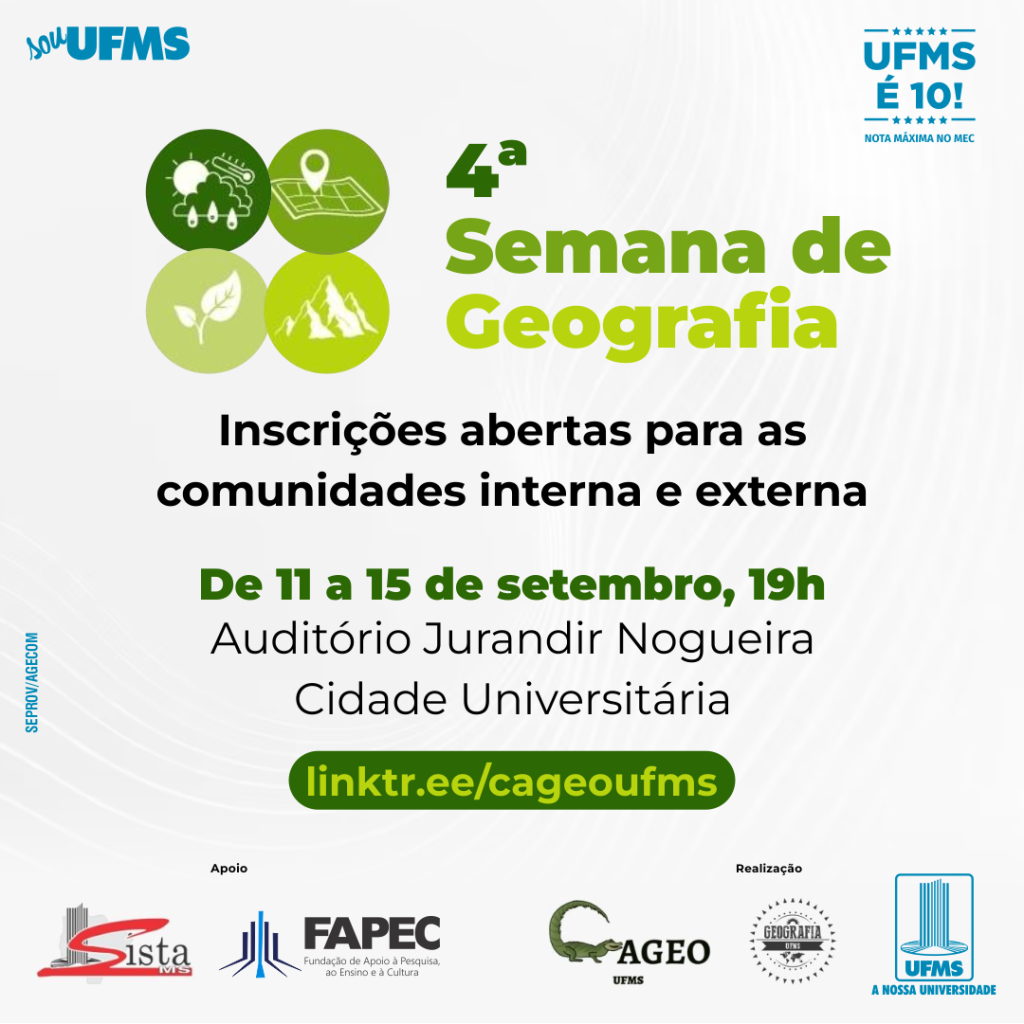 Entre os dias 11 e 15 de setembro, será realizada a 4ª edição da Semana de Geografia, que este ano apresenta o tema Geografia, Meio Ambiente e Território. O evento será realizado no Auditório Jurandir Nogueira, na Cidade Universitária, todos os dias às 19h.