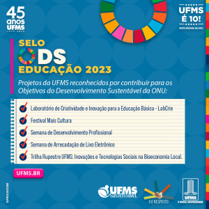 Todos os projetos cadastrados pela Universidade nesta edição receberam o Selo ODS. As iniciativas reconhecidas foram o Laboratório de Criatividade e Inovação para a Educação Básica (LabCrie); Festival Mais Cultura; Semana de Desenvolvimento Profissional; Semana de Arrecadação de Lixo Eletrônico; e Trilha Rupestre UFMS: Inovações e Tecnologias Sociais na Bioeconomia Local.