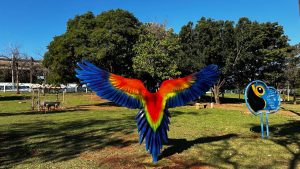 “Em 2021, a UFMS foi uma das localidades a receber os totens do Circuito das Araras, projeto do Instituto Arara Azul que tem como objetivo valorizar a presença dessas aves em Campo Grande. Como o totem foi fixado no Bosque Central, optamos por instalar a Asa de Arara ao seu lado. Assim, também despertamos mais a atenção de quem transita pelo Corredor Central e estacionamento para visitar o Parque da Ciência”, explica a professora da Faculdade de Computação e uma das responsáveis pelo Parque, Luciana Montera.